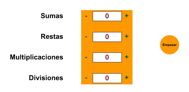 Verás que en la segunda y en la tercera fase hay una cigüeña de color amarillo. Esta cigüeña da la posibilidad a los padres o maestros de construir una serie con el número de operaciones que desees: bastará con hacer clic sobre los signos + ó - situados a derecha e izquierda de los números. Cuando hayamos confeccionado la sesión a nuestro gusto presionaremos sobre el botón Empezar.