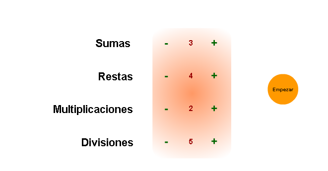 Estas cigüeñas nos dan la posibilidad de construir series con el número de operaciones que deseemos: bastará con hacer clic sobre los signos + ó - situados a derecha e izquierda de los números. Cuando hayamos confeccionado la sesión a nuestro gusto presionaremos sobre el botón Empezar.