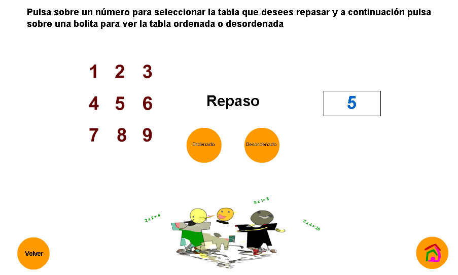 En esta pantalla podremos repasar las tablas de multiplicar, no hay más que hacer clic sobre un número y a continuación sobre una bolita, así podremos ver la tabla de forma ordenada o aleatoria (desordenada).