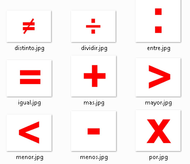 La carpeta signos y el fichero signos.pdf incluyen imágenes con los signos para realizar operaciones aritméticas y comparaciones.