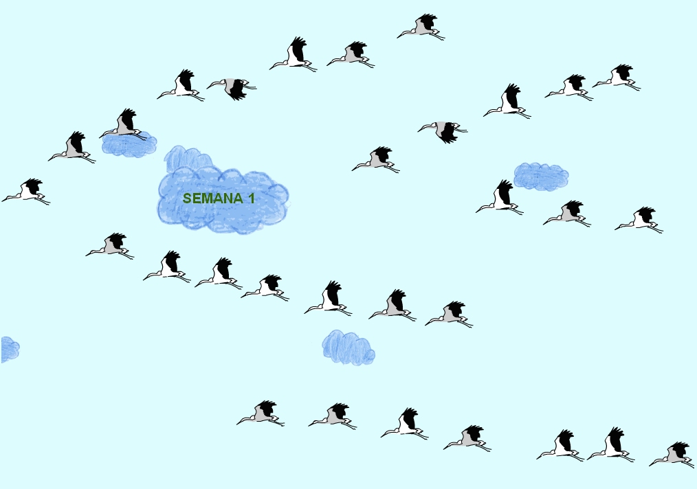 Entrar, da acceso a esta aplicación interactiva. Veremos un dibujo inicial y a continuación una pantalla con treinta cigüeñas, cada una nos presenta una de las treinta semanas de las que consta el curso. Cuando movamos el puntero del ratón sobre las cigüeñas aparecerá una nube con un texto que nos indica la semana que va a mostrar.